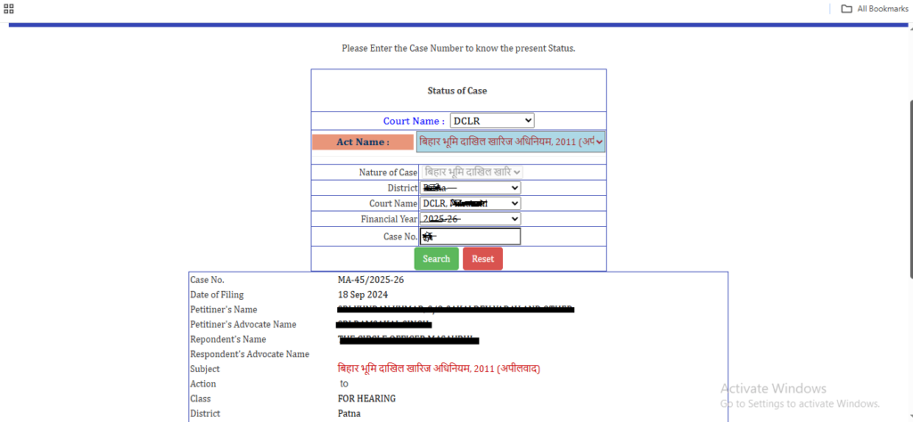 - उसके बाद Court Name में ” DCLR” का चयन करें और Act Name में ” बिहार भूमि दाखिल ख़ारिज अधिनियम,2011 (अपीलवाद ) का चयन करें |